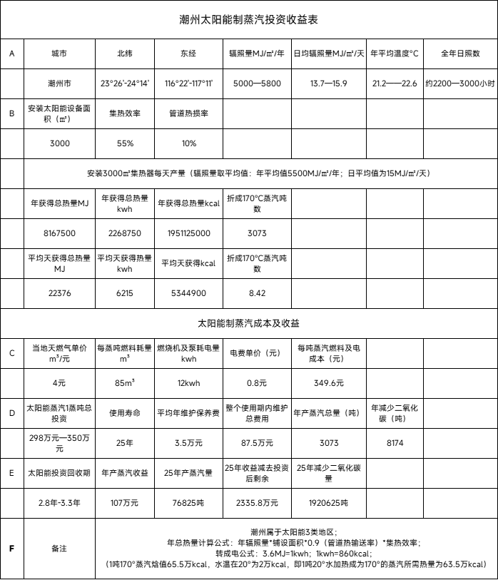 潮州太阳能制蒸汽安装3000㎡集热器每天产量(辐照量取平均值:年平均值5500MJ/㎡/年;日平均值为15MJ/㎡/天)